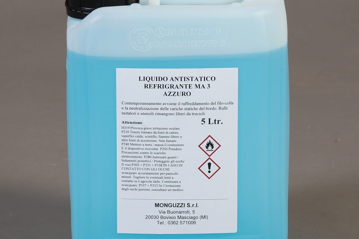 L’agente antistatico refrigerante Monguzzi MA3 è un agente che raffredda e indurisce velocemente il filo colla e scarica le cariche elettrostatiche dei trucioli del bordo che non si attaccheranno al pannello o ai rulli copiatori.